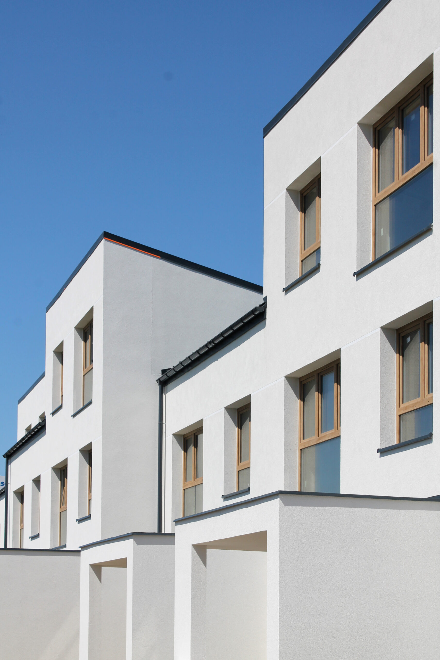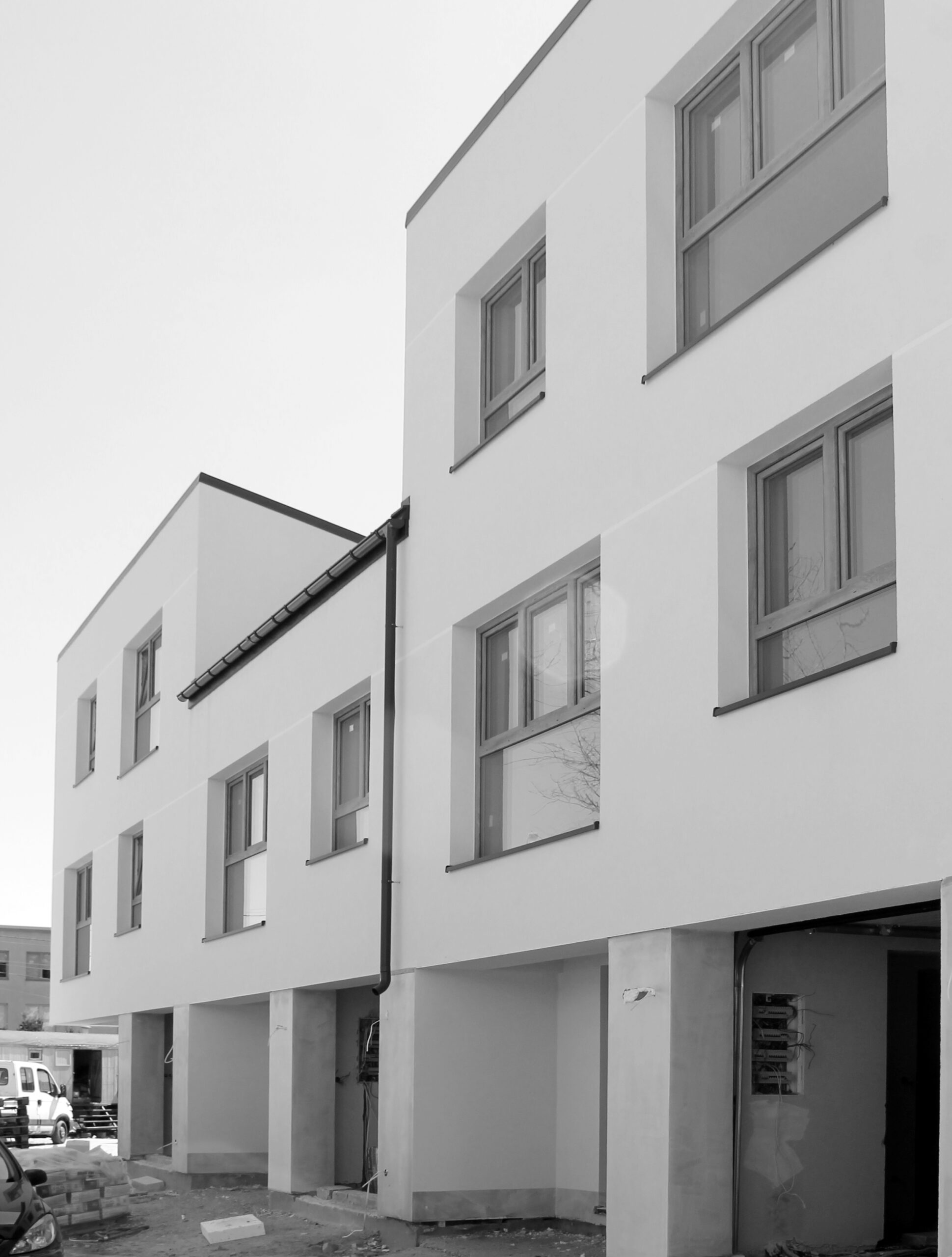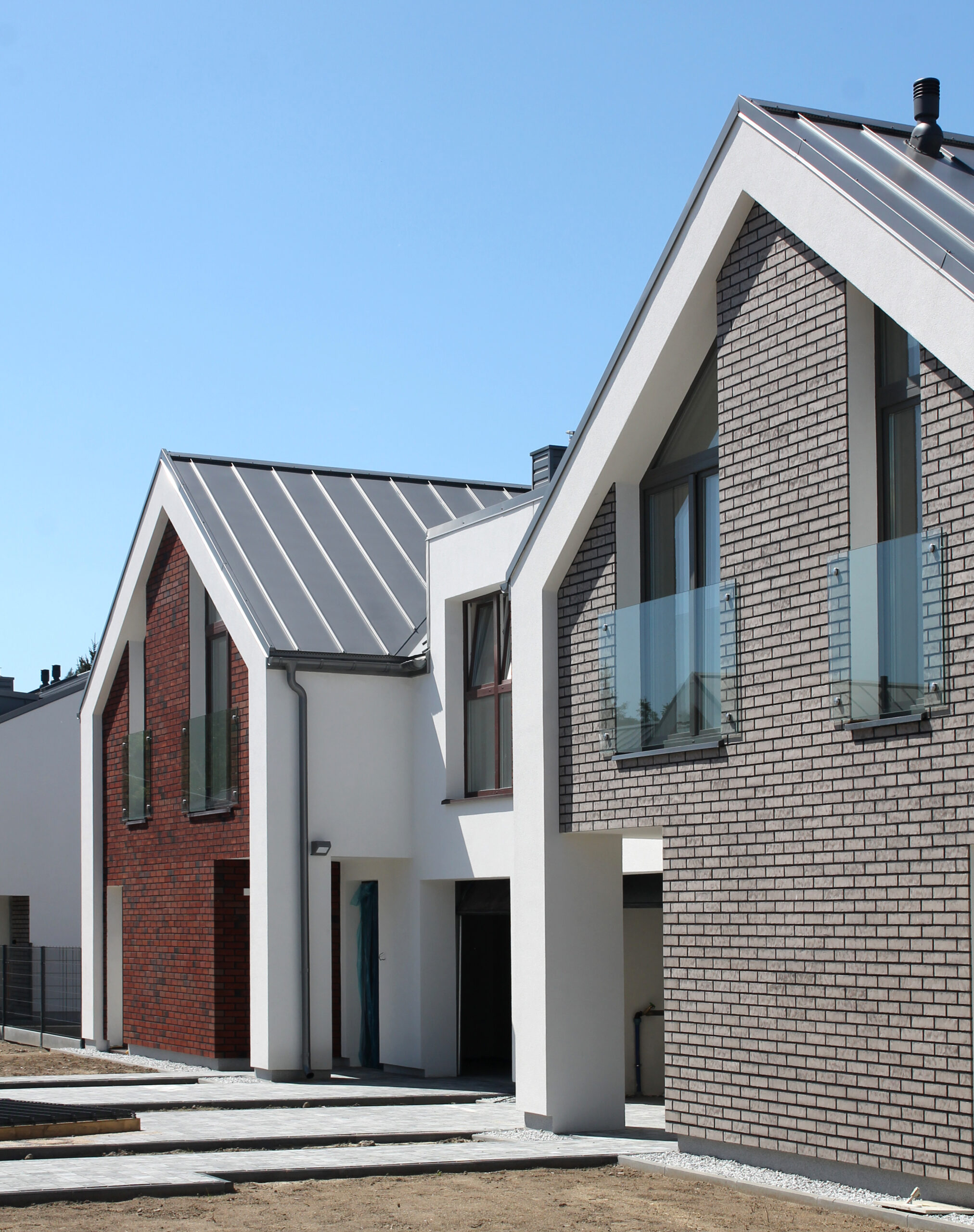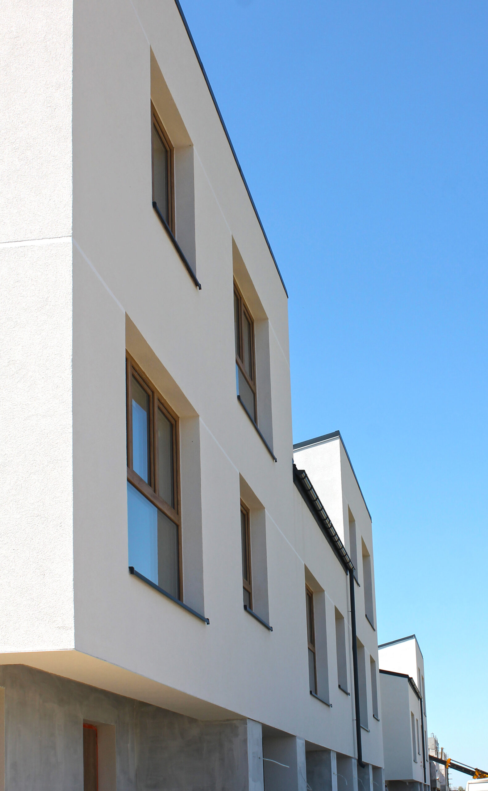 Niewielki zespół budynków jednorodzinnych w zabudowie szeregowej. Pięć budynków o analogicznym planie zróżnicowanych układem okien na elewacji oraz wykorzystaniem na 3 kondygnacji otwartej loggii, co w efekcie zmienia skalę budynku. Wszystkie budynki zadaszone jednospadowym dachem pochyłym z blachy szarej tytan cynk, elewacje zaś wykończone czerwoną cegłą. Okna drewniane dodatkowo wyposażone w okiennice w kolorze stolarki w układzie desek poziomych