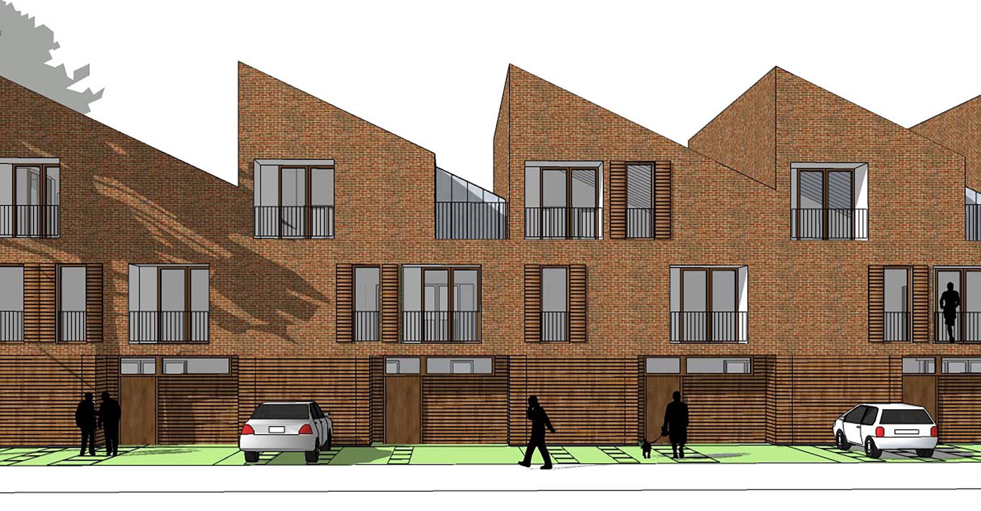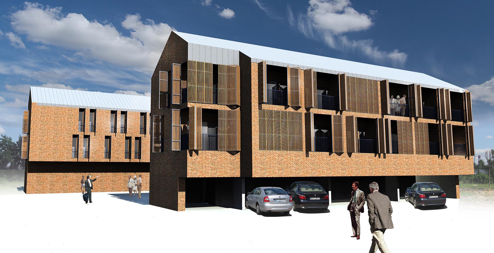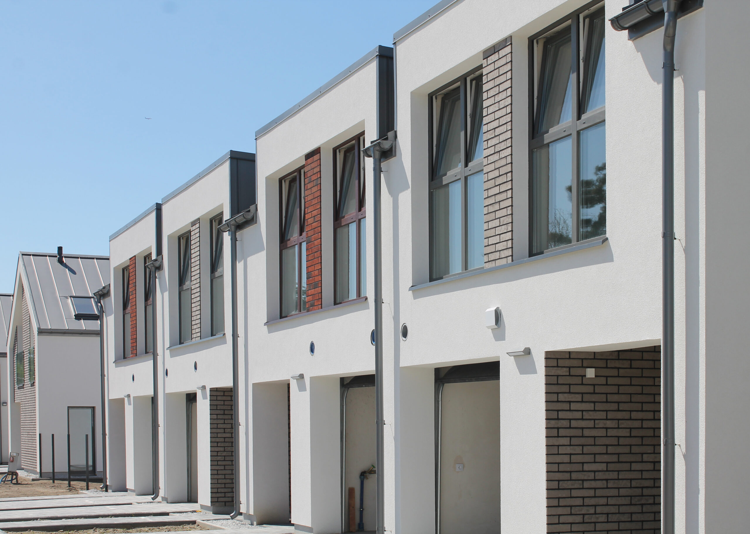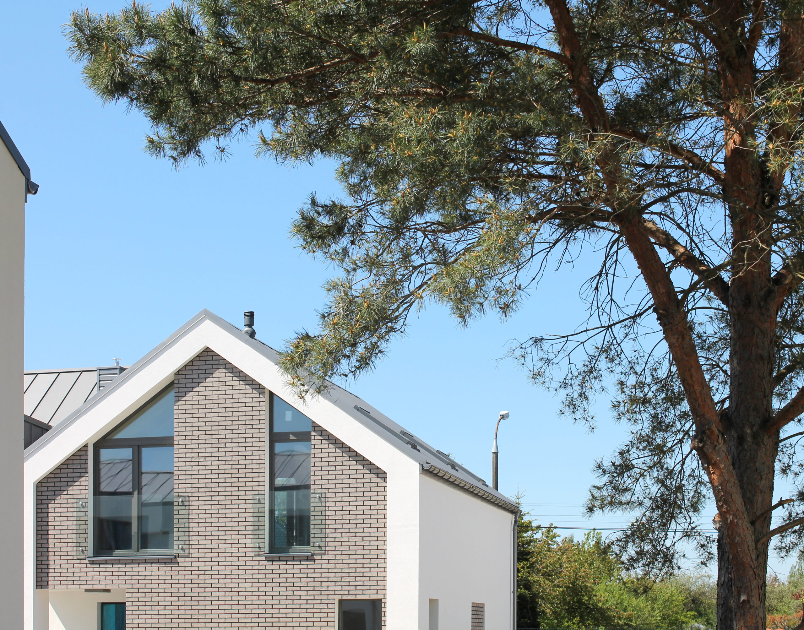 Niewielki zespół budynków jednorodzinnych w zabudowie szeregowej. Pięć budynków o analogicznym planie zróżnicowanych układem okien na elewacji oraz wykorzystaniem na 3 kondygnacji otwartej loggii, co w efekcie zmienia skalę budynku. Wszystkie budynki zadaszone jednospadowym dachem pochyłym z blachy szarej tytan cynk, elewacje zaś wykończone czerwoną cegłą. Okna drewniane dodatkowo wyposażone w okiennice w kolorze stolarki w układzie desek poziomych