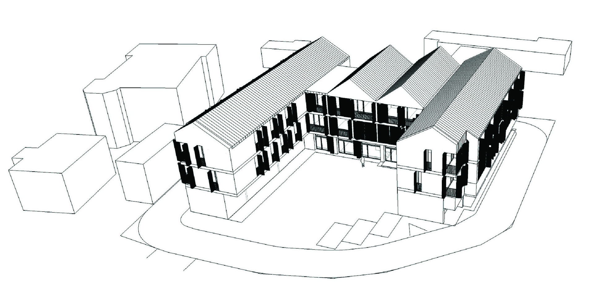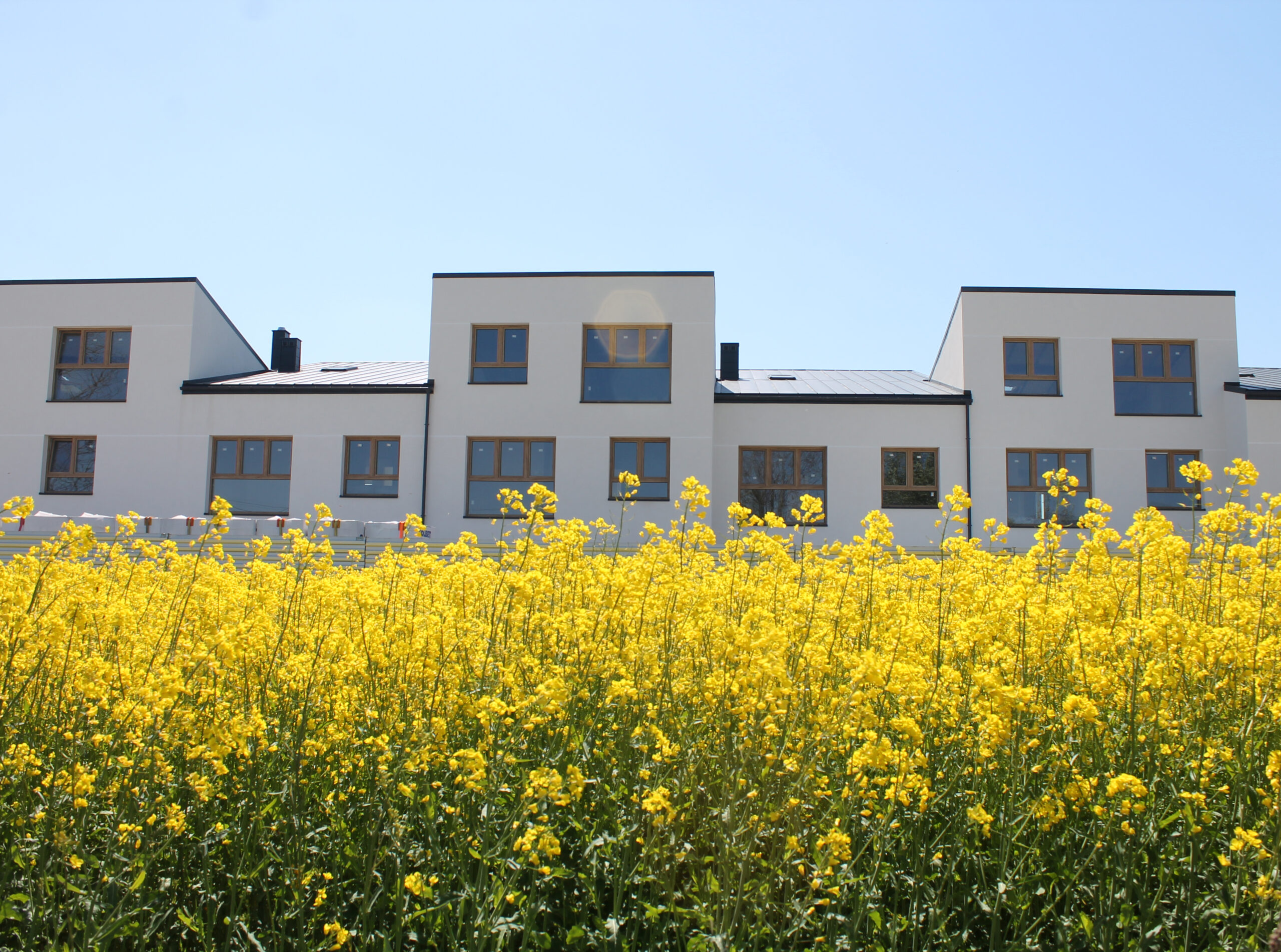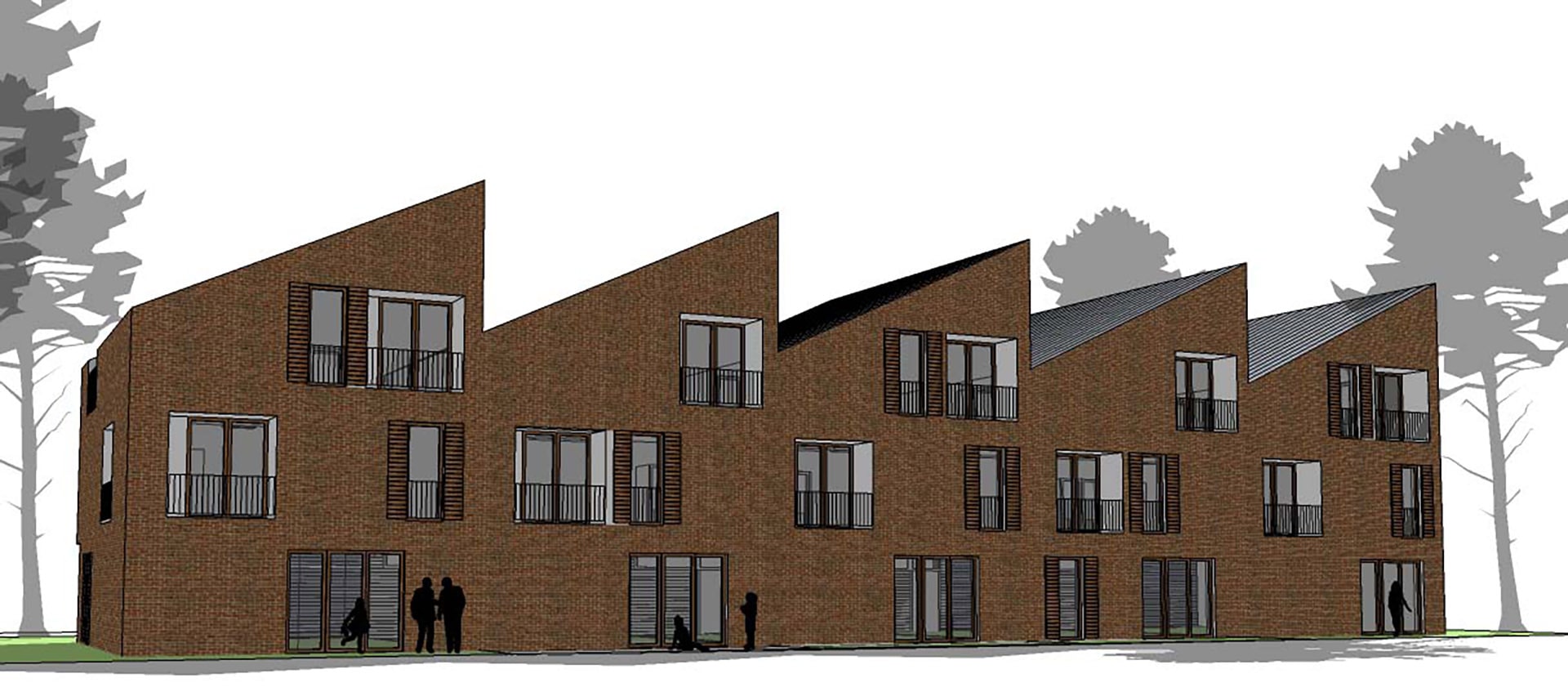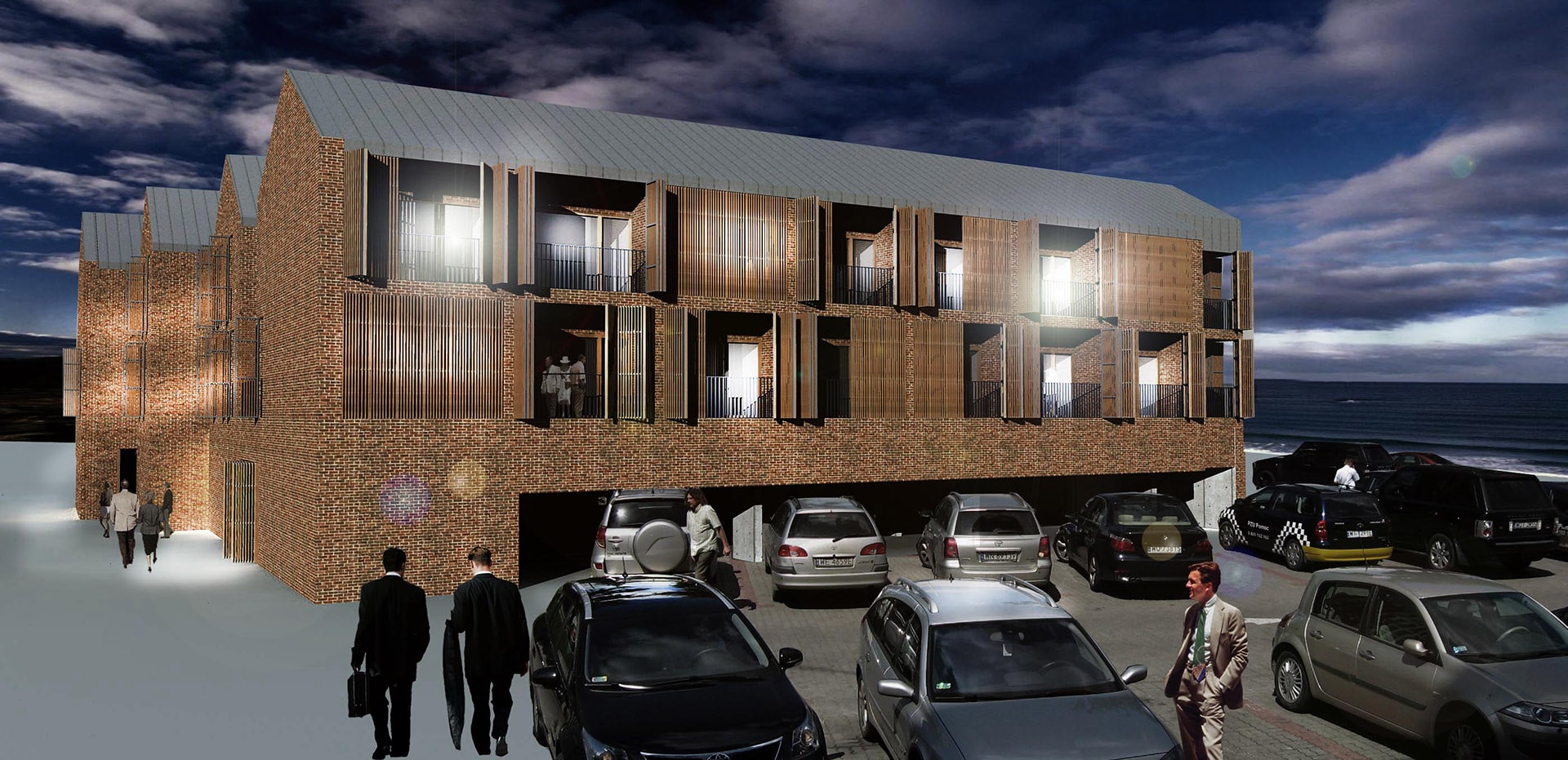 Niewielki zespół budynków jednorodzinnych w zabudowie szeregowej. Pięć budynków o analogicznym planie zróżnicowanych układem okien na elewacji oraz wykorzystaniem na 3 kondygnacji otwartej loggii, co w efekcie zmienia skalę budynku. Wszystkie budynki zadaszone jednospadowym dachem pochyłym z blachy szarej tytan cynk, elewacje zaś wykończone czerwoną cegłą. Okna drewniane dodatkowo wyposażone w okiennice w kolorze stolarki w układzie desek poziomych