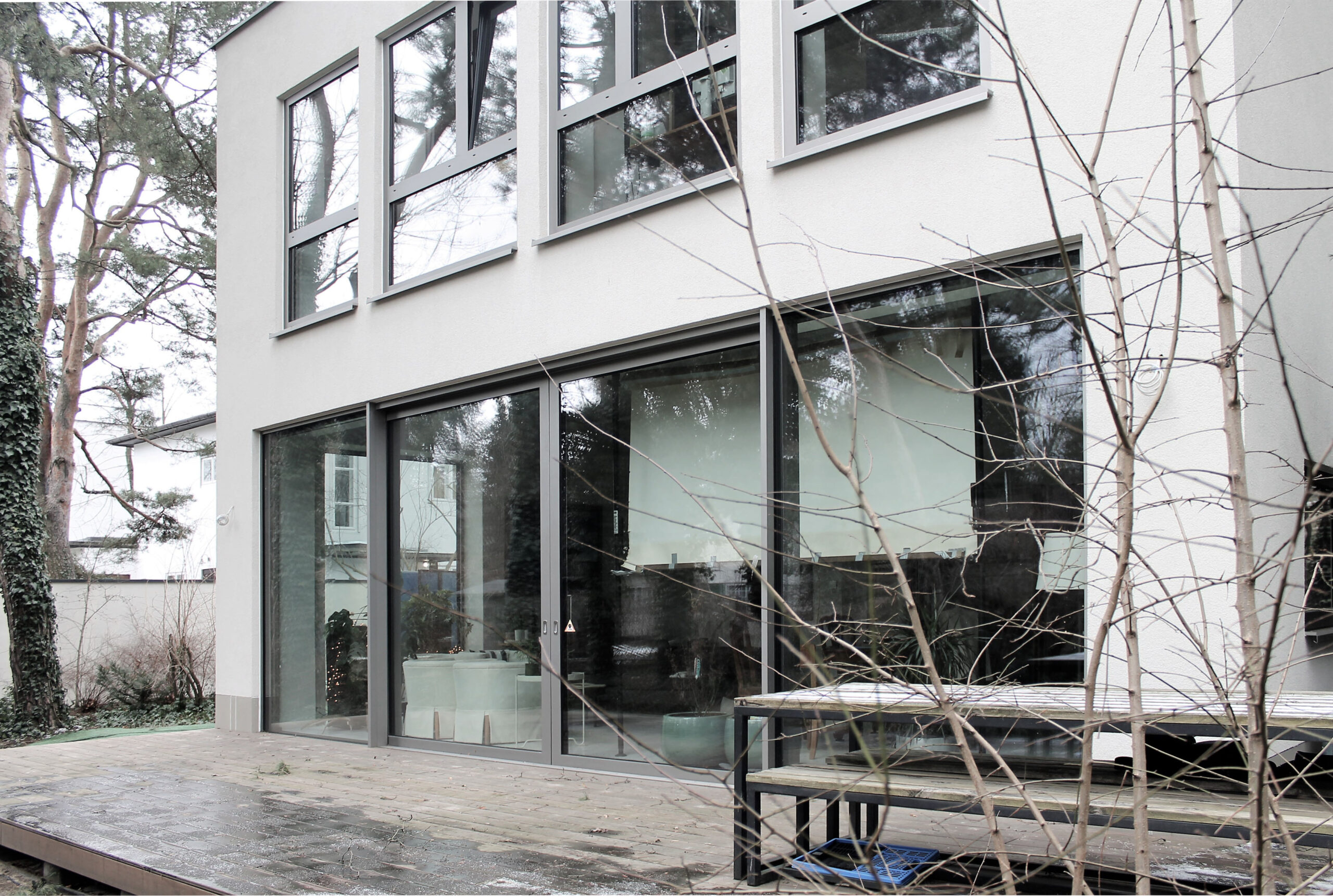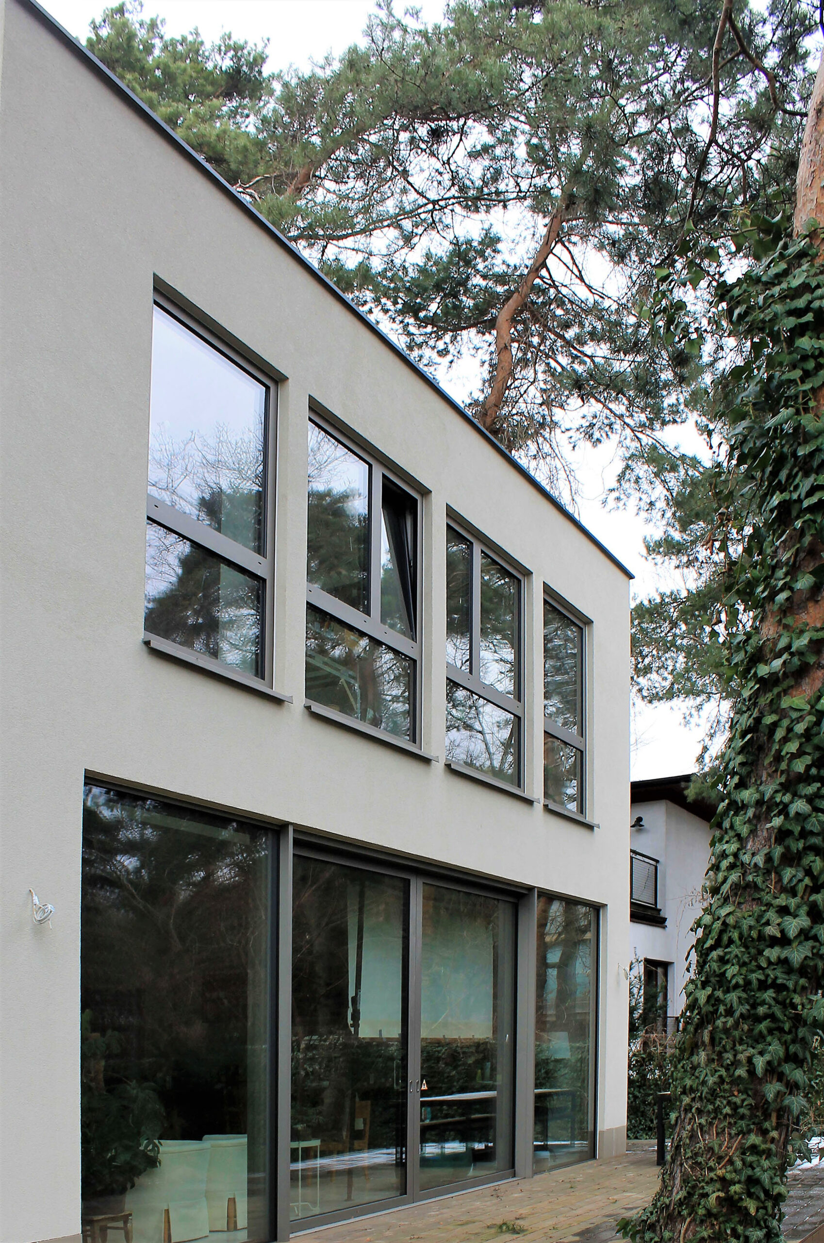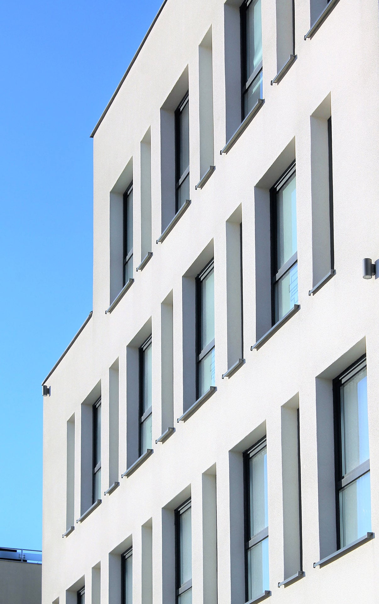 Elewacje w części parteru zaprojektowano jako okładzina z ciemnego materiału – płyty ceramiczne lub włókno-cementowe. Wyższe kondygnacje są wykończone w tynku białym, drobnoziarnistym na izolacji termicznej. Kompozycję elewacji tworzą rytmicznie powielający się wzór okien: wąskiego na przemian z szerszym oknem. Okna aluminiowe w kolorze ślusarki – ciemno szary.